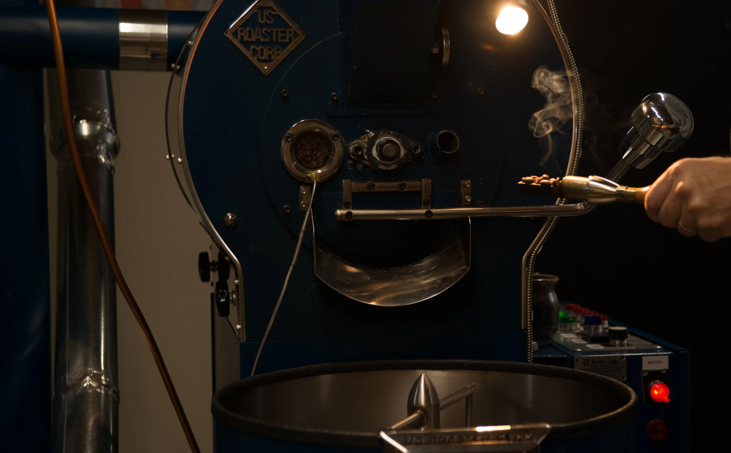 We are a micro-roaster (under 50k lbs./year) using a 5K roaster from US Roaster Corp in Oklahoma City. Each batch produces about ten pounds of roasted coffee. Because of our small batch size, we roast several days each week to keep our customers supplied with fresh coffee. A distinguishing characteristic of our coffee is the complexity: several of our blends have six or more different origins. The result is a more nuanced cup of coffee that is nearly impossible to match with a blend of two or three beans or a single origin.